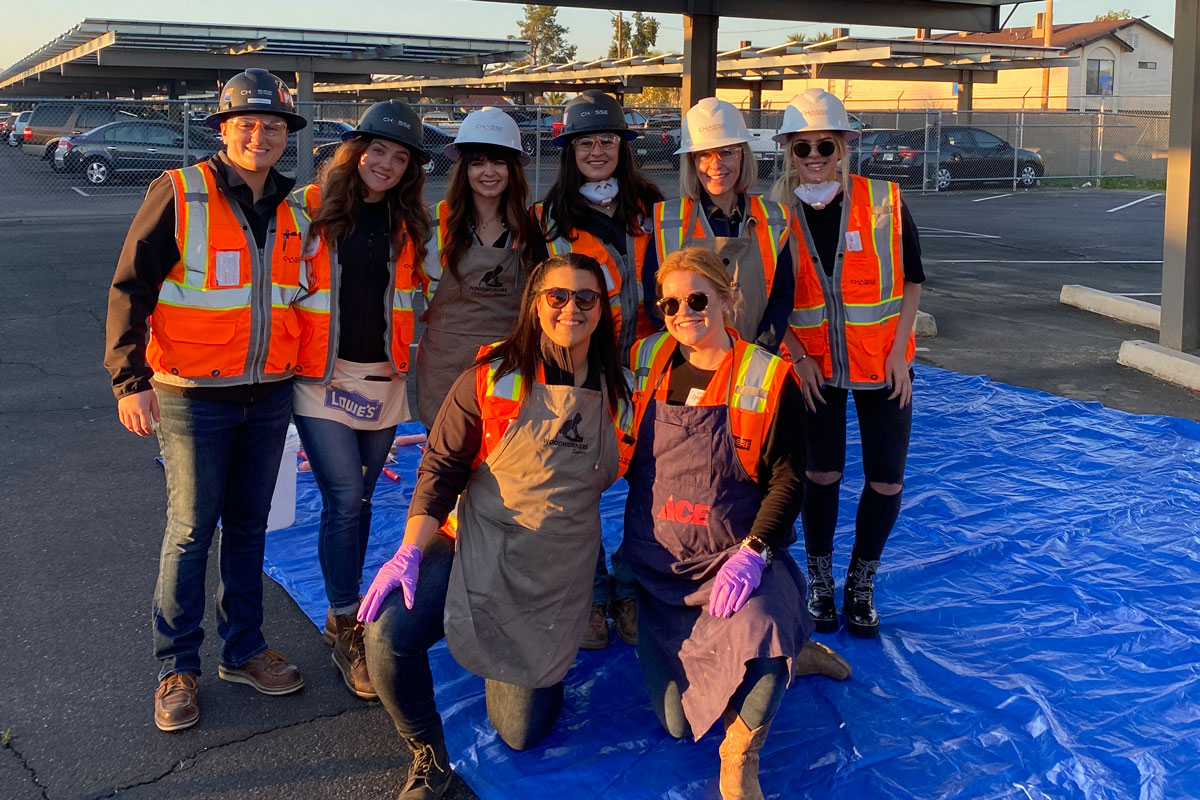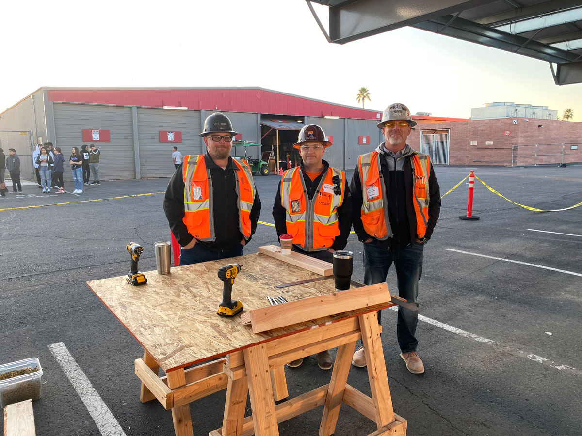 Students started by measuring and cutting lumber for the tabletops, then moved to assembling and drilling the table pieces together, sanding down the tables, branding the tables with the Agua Fria and CHASSE logos, and finally staining the tables! Students were able to talk with mentors from CHASSE and our industry trade partners to learn more about specific trades within construction!