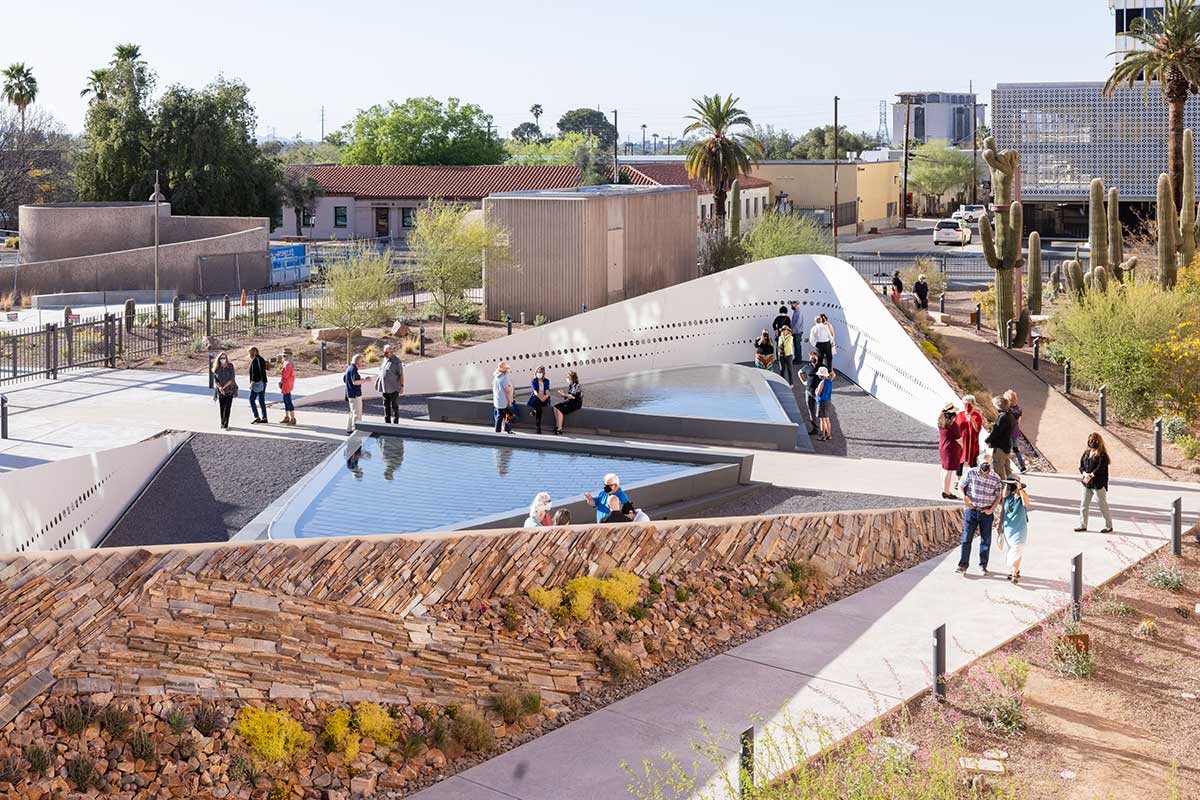Serving as a permanent reminder of those who lost their lives during a mass shooting on January 8, 2011, a new memorial, The Embrace, will be located in El Presido Park in Tucson, Arizona. The memorial will commemorate the wonderful Tucson spirit that emerged following the 2011 tragedy, and remind future generations how we can all continue to build a better community through active participation.