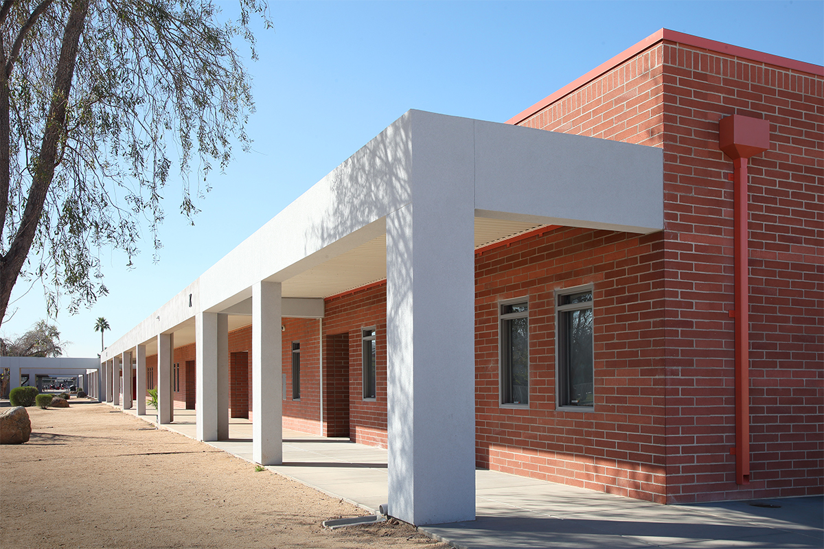 Building E was an existing classroom building with five classrooms. CHASSE demolished the interior space (except for the restroom) and renovated 8,638 SF. Building E turned into six classrooms and a “flex” space, which is a common area between the classrooms. Building E is highlighted by the operable glass partitions in room E2, E4, and E6. In addition, Building E also received a “makerspace” which is used for interactive labs and collaborative group work with a garage door facing the campus allowing more space for the students and for enjoying the great Arizona weather!