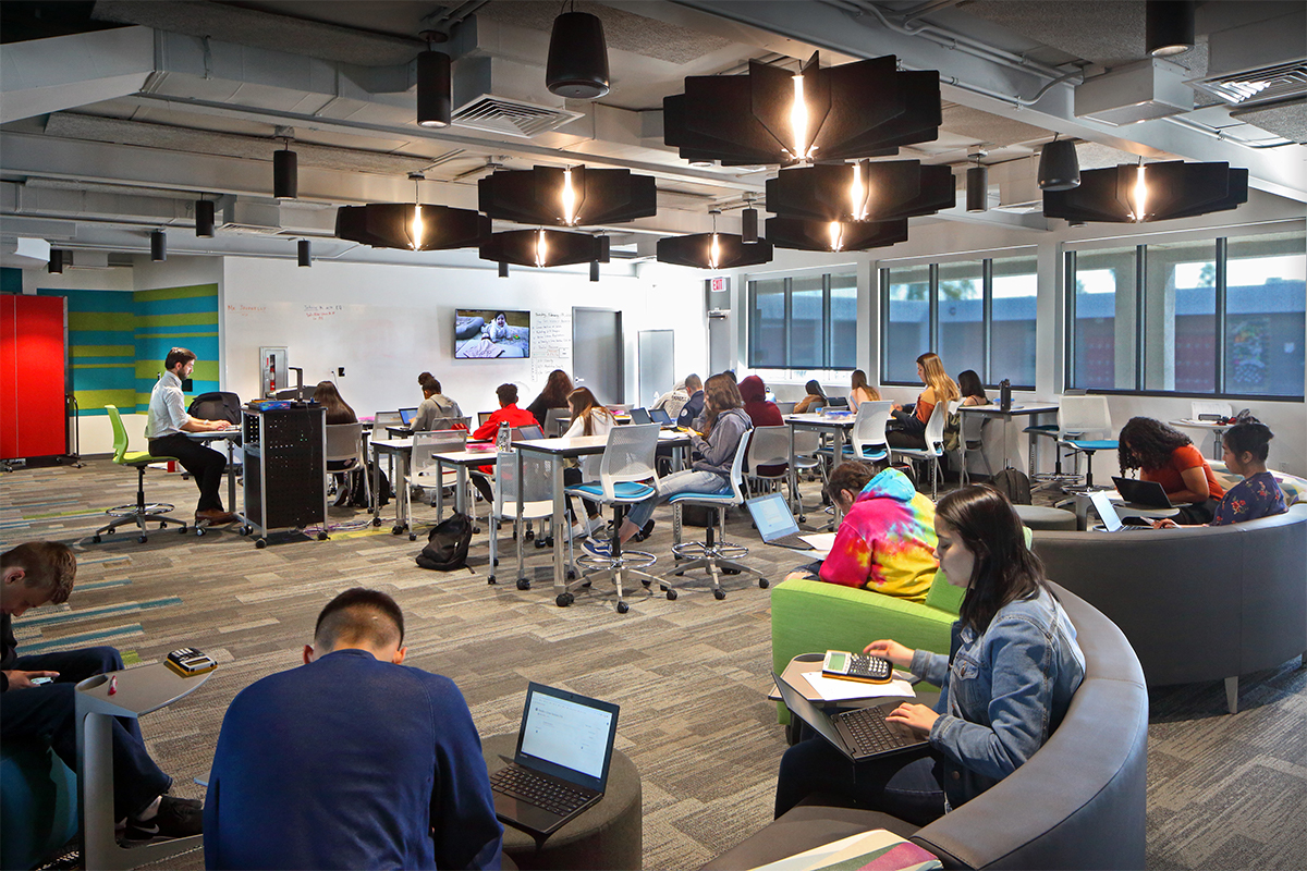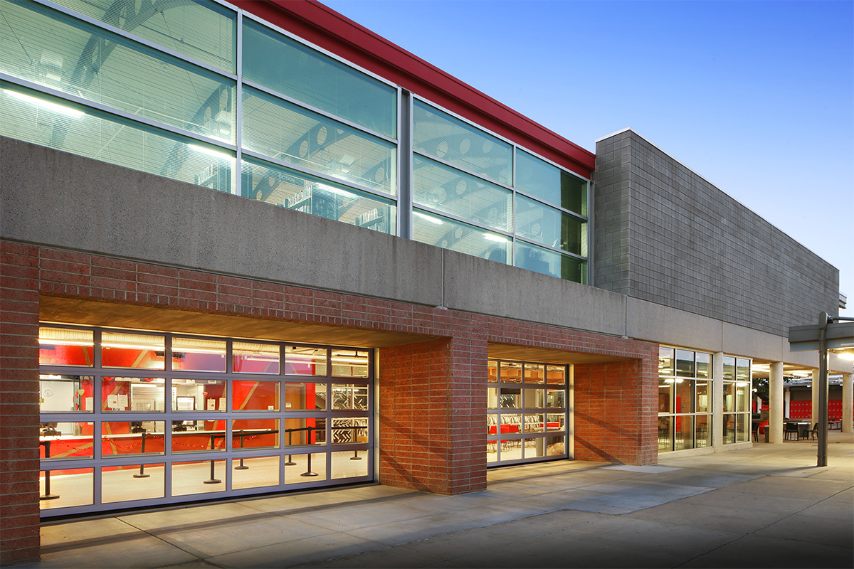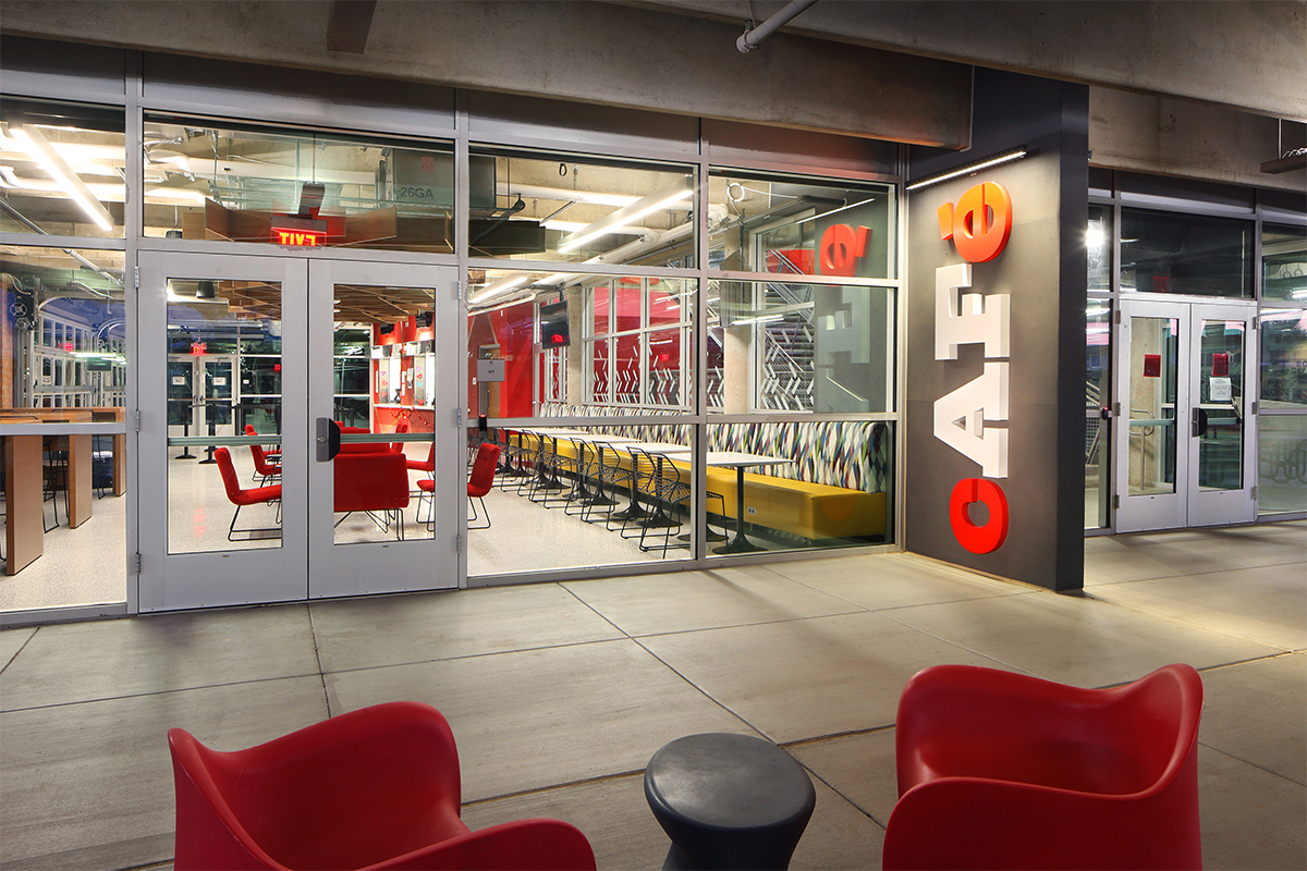 This three-building renovation transformed dated classroom spaces into modern labs, open classrooms and unique student gathering spaces. Two of the buildings had multiple classrooms replaced with new classrooms featuring operable glass partitions, flex space and a maker space with a functioning garage door, used for interactive labs and group work. The team utilized the open space beneath the existing library to create a new cafe and hang out space for students. The cafe, which is enclosed with storefront glass, includes a variety of seating and two garage doors, which creates an open, college-like gathering space for students. In order to minimize disruption on campus, CHASSE utilized temp fencing and custom vinyl window graphics to hide construction, as well as minimize trade worker foot traffic during passing periods.