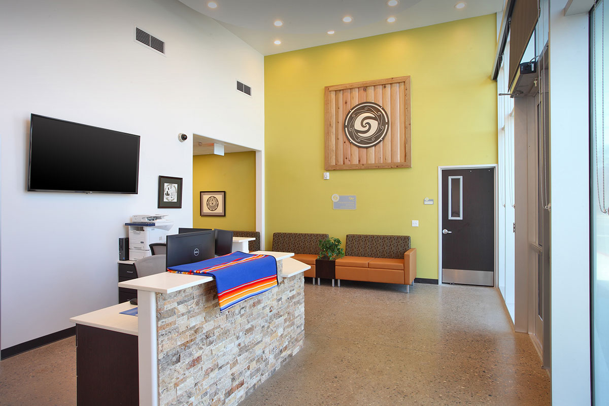 This project consists of two structures connected by a central, culturally amenitized courtyard. The first building, a 30,000 SF, three-story structure provides behavioral health services and counseling to an underserved, distressed population. Amenities include a full commercial kitchen, fitness center, talking circle for group therapy, 18 ADA-accessible sleeping pods, sweat lodges, basketball court, child play and family visitation areas, craft room and program space designed to foster healing and personal growth. The second building, a 92,000 SF, single story structure houses administrative staff and three ADA-accessible transitional housing units.