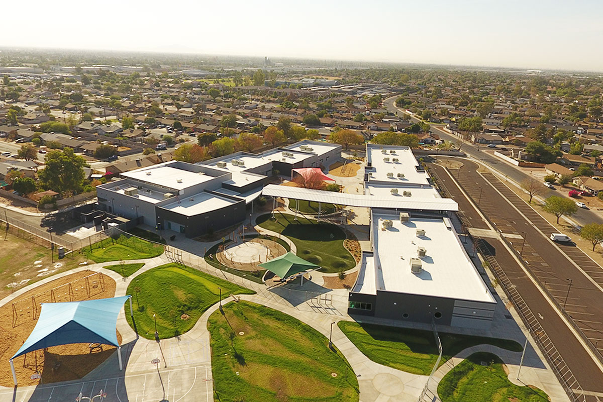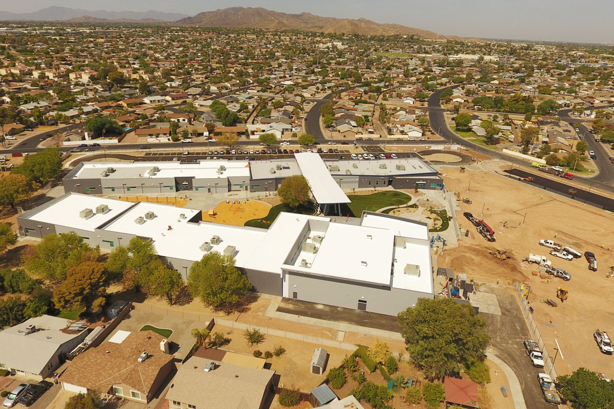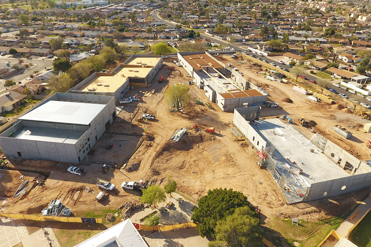 The rebuild included thirty new classroom spaces, a new administration and learning commons building, and new multipurpose room and cafeteria. The new campus provides ample opportunity for natural daylight in each space and is complete with polished concrete floors and an outdoor dining area. Additionally, the project includes a new bus drop and parent drop-off area which provides more parking opportunities.